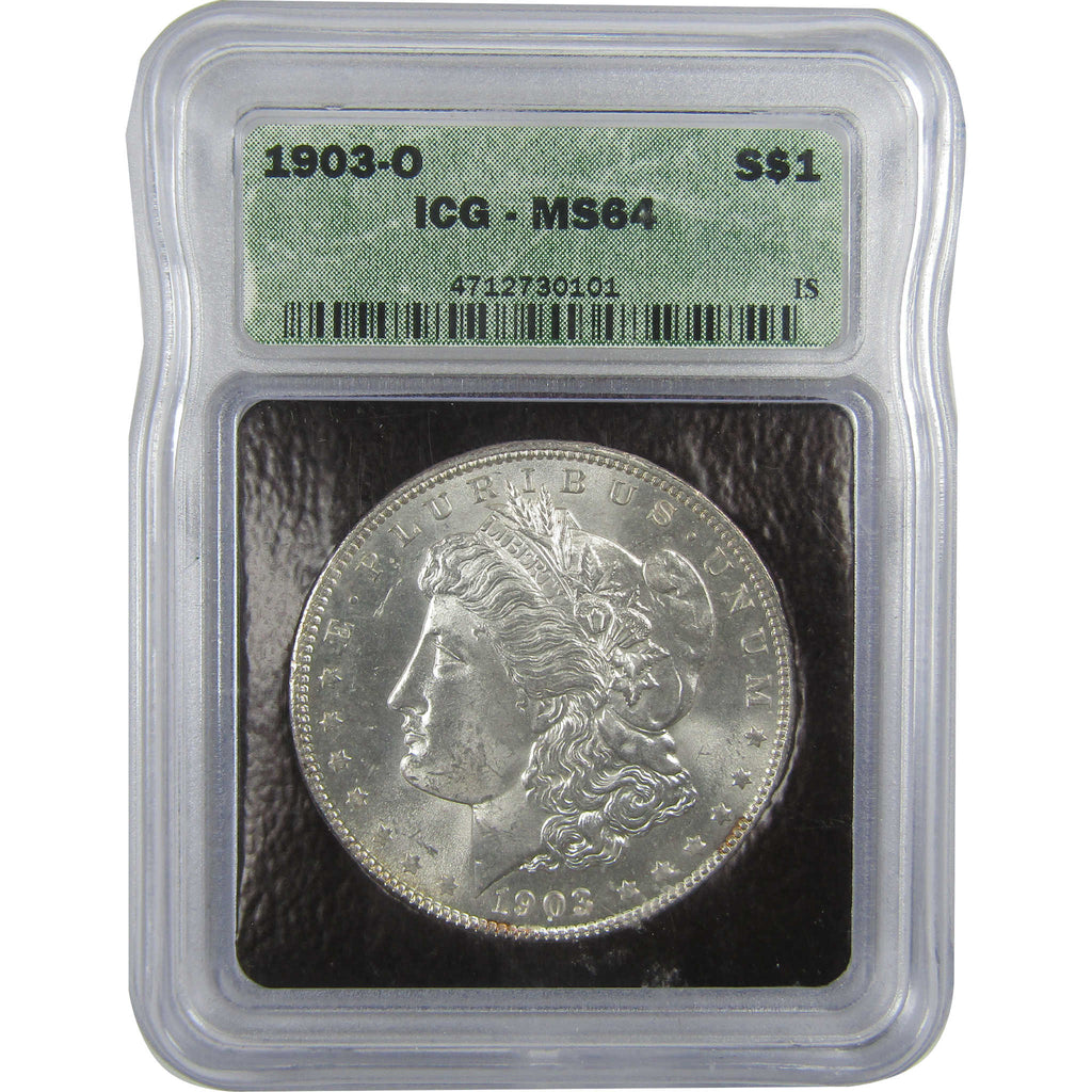 A genuine 1903 O Morgan Silver Dollar Coin, graded and certified MS 64 by ICG. Contains 90% Silver