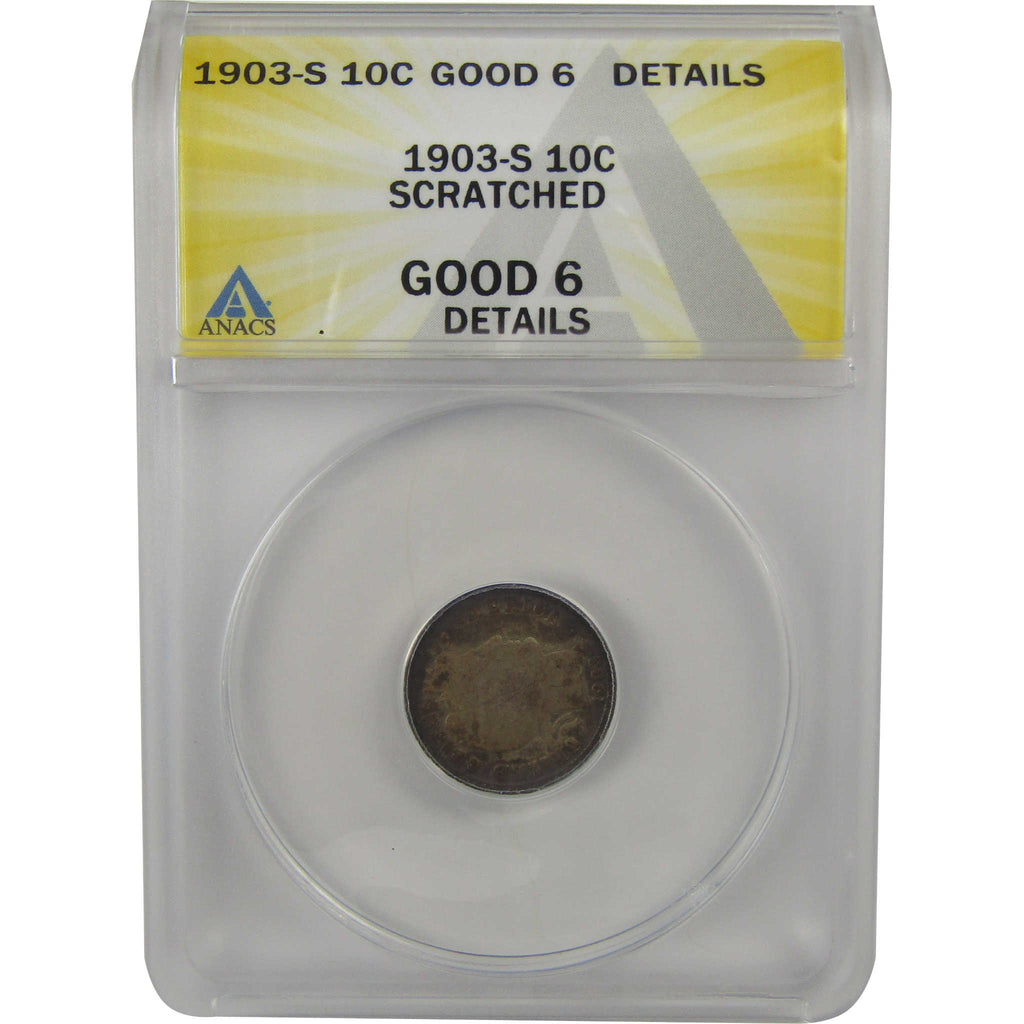 A genuine 1903 S Barber Silver Dime Coin, graded and certified G 6 Details by ANACS. Contains 90% Silver. Scratched