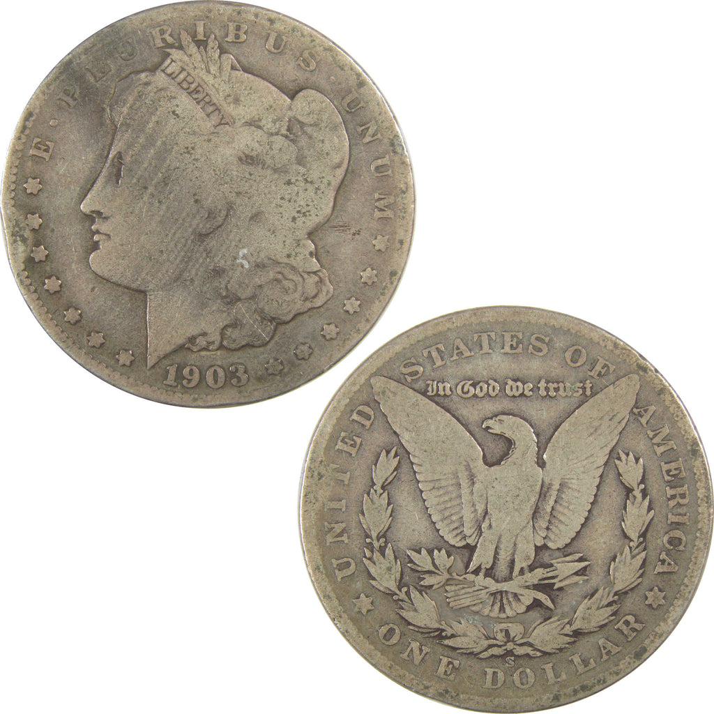 A genuine 1903 S Morgan Silver Dollar Coin, in AG About Good Details Condition. Contains 90% Silver. Rim Damage