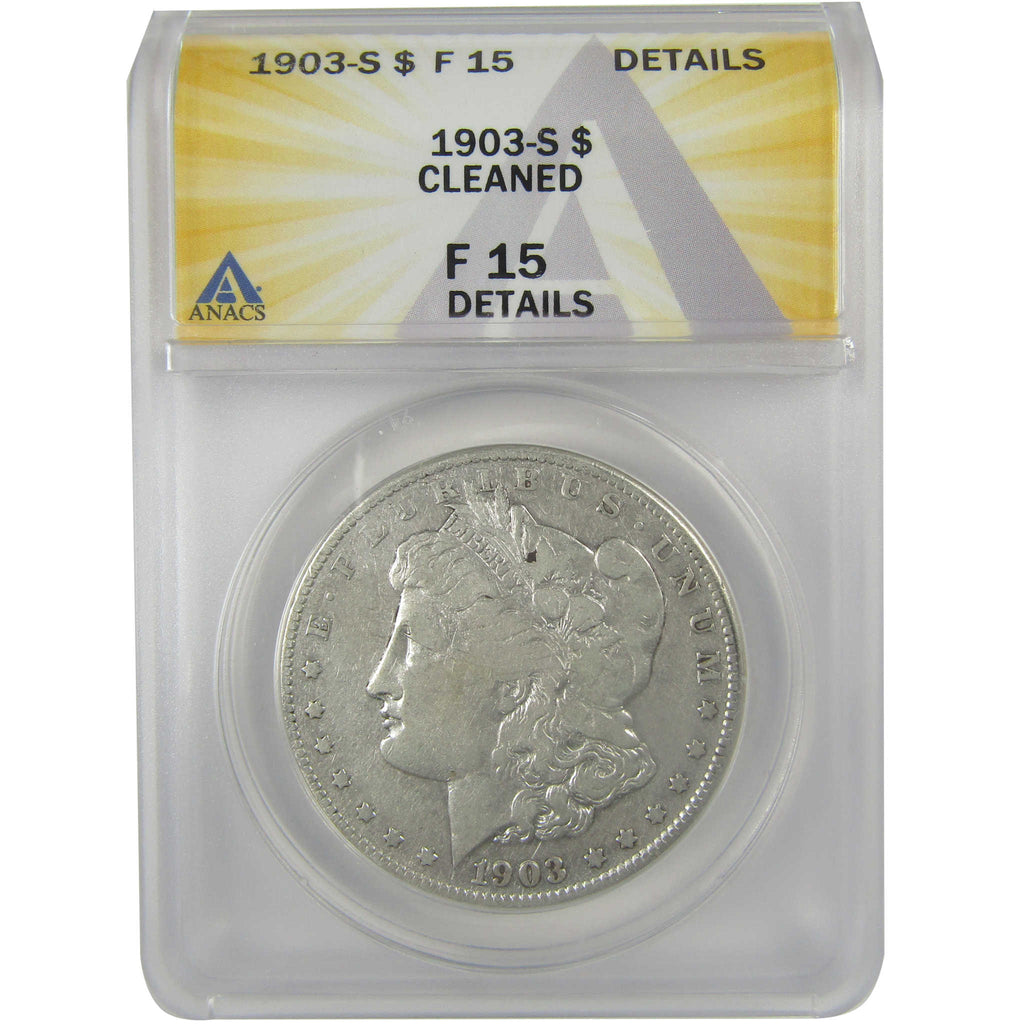 A genuine 1903 S Morgan Silver Dollar Coin, graded and certified F 15 Details by ANACS. Contains 90% Silver. Cleaned
