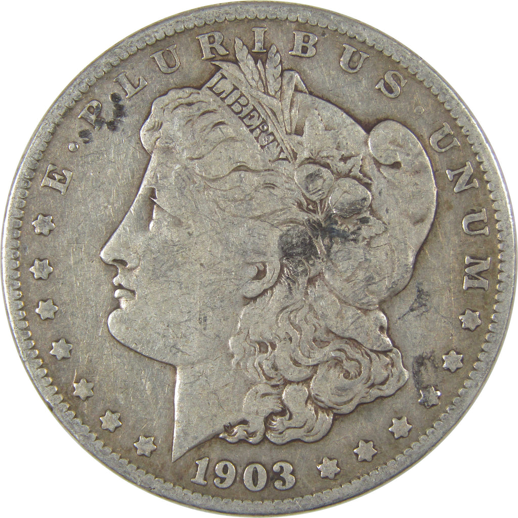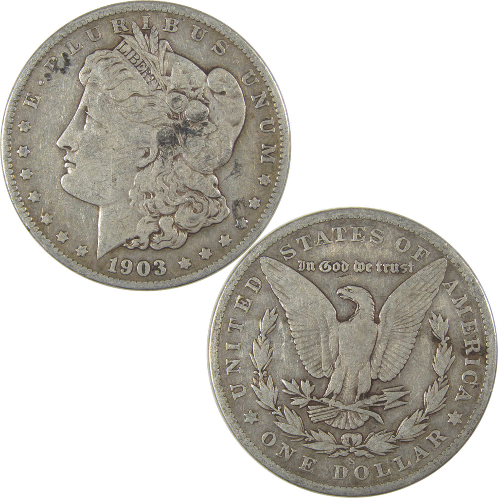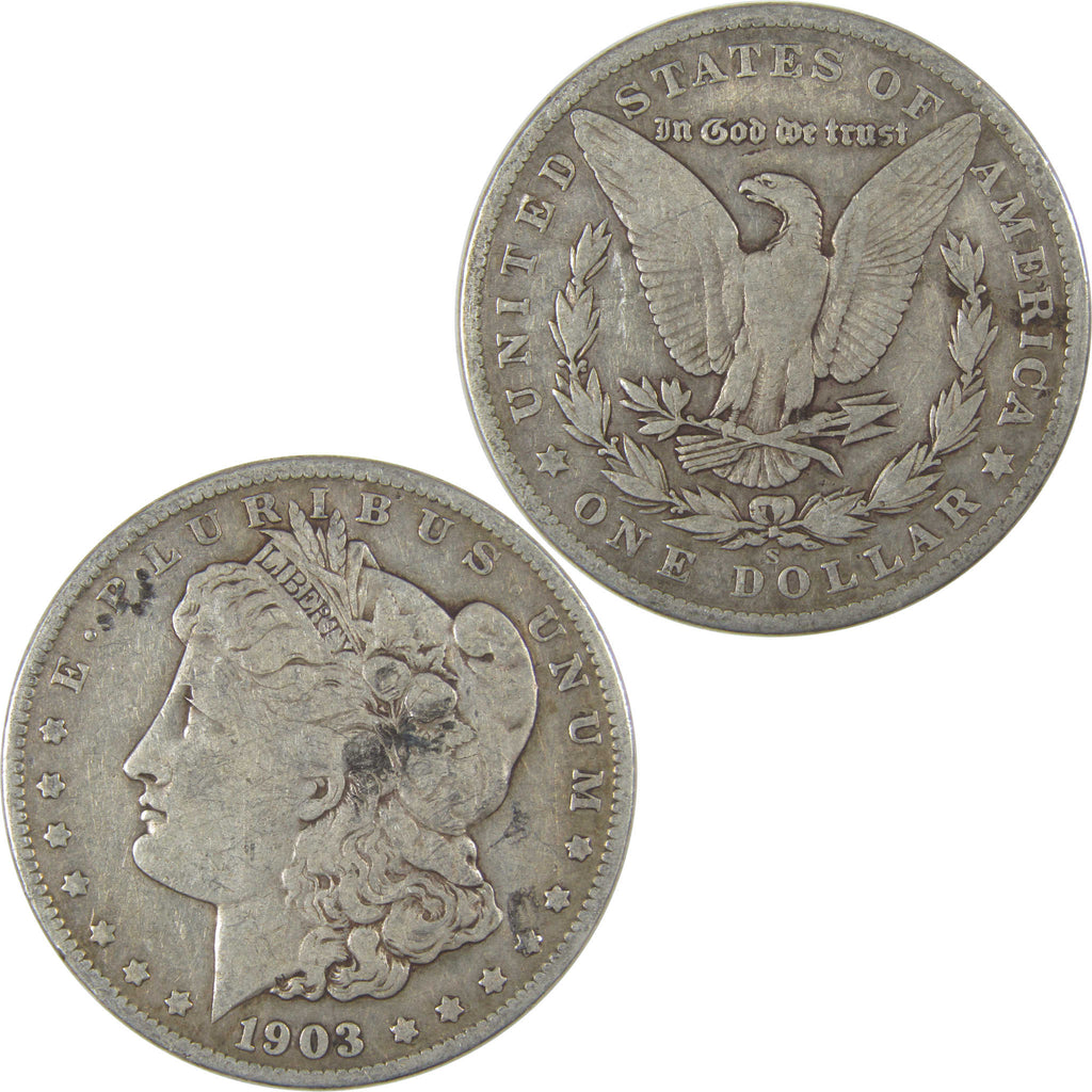 A genuine 1903 S Morgan Silver Dollar Coin, in F Fine Details Condition. Contains 90% Silver. Damaged