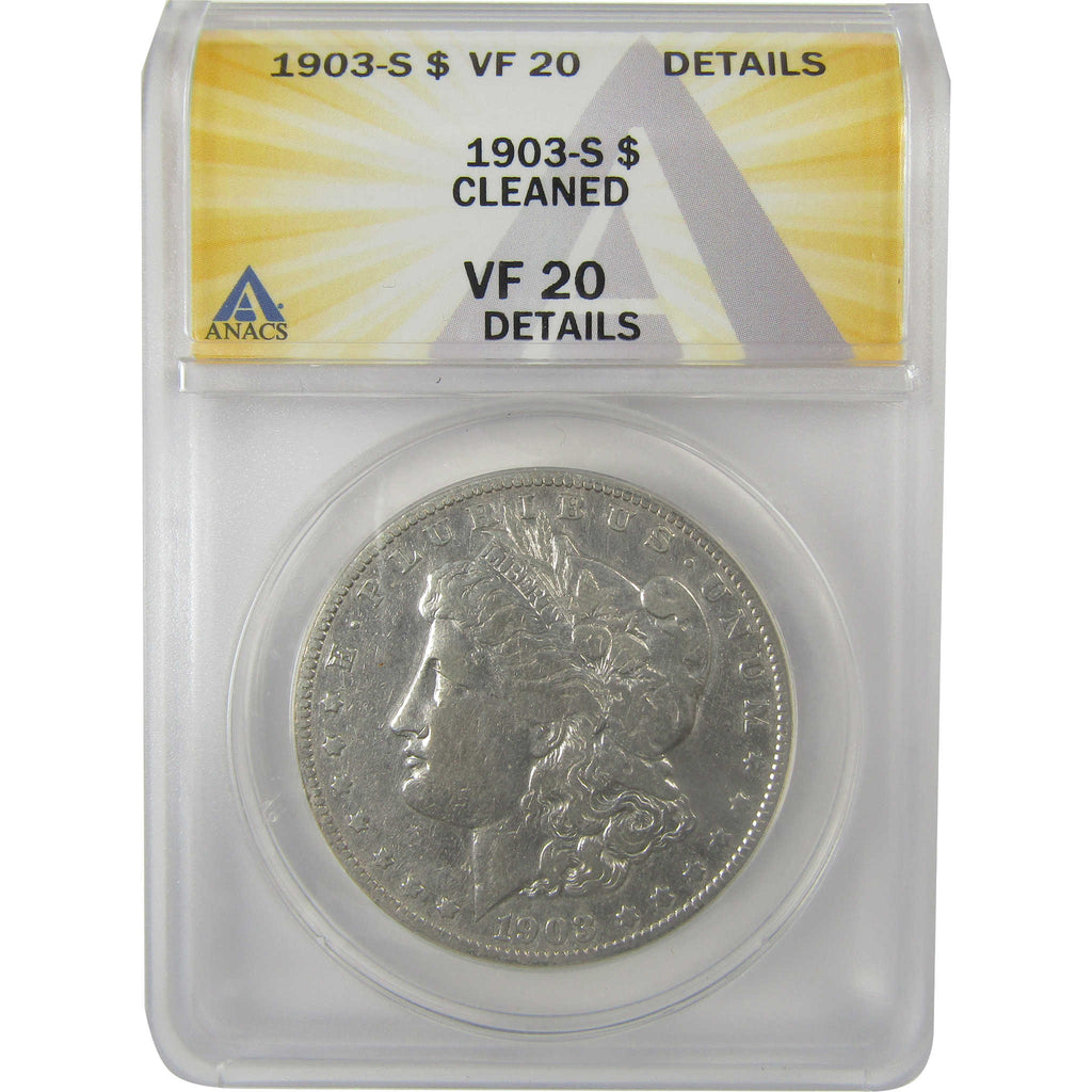 A genuine 1903 S Morgan Silver Dollar Coin, graded and certified VF 20 Details by ANACS. Contains 90% Silver. Cleaned