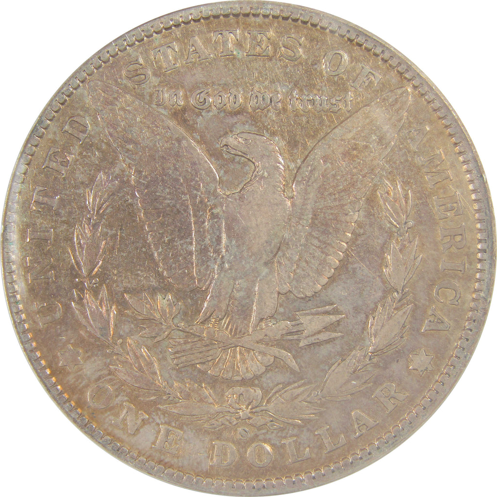 This large 90% silver Morgan dollar bears George T. Morgan's classic depiction of Liberty facing left in a Phrygian cap and a spray of leaves held by a ribbon inscribed LIBERTY. The reverse features an eagle clutching a branch and three arrows.