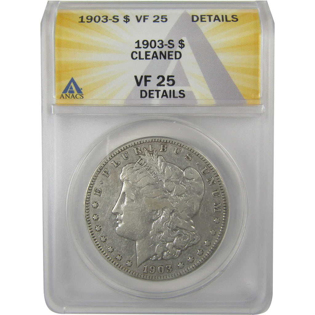 A genuine 1903 S Morgan Silver Dollar Coin, graded and certified VF 25 Details by ANACS. Contains 90% Silver. Cleaned