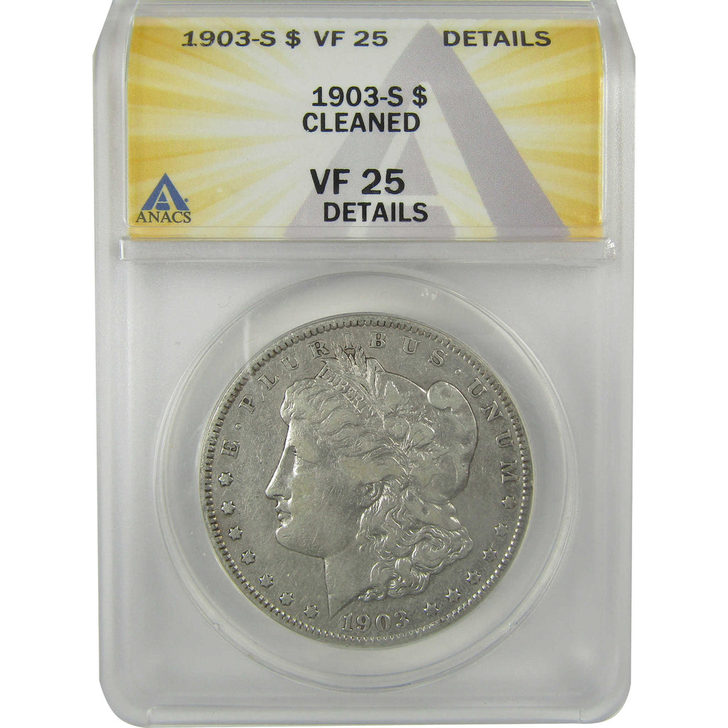 A genuine 1903 S Morgan Silver Dollar Coin, graded and certified VF 25 Details by ANACS. Contains 90% Silver. Cleaned