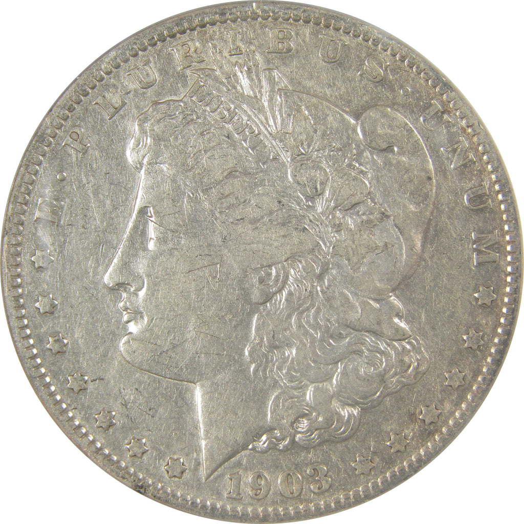 A genuine 1903 S Morgan Silver Dollar Coin, graded and certified VF 25 Details by ANACS. Contains 90% Silver. Graffiti, Cleaned