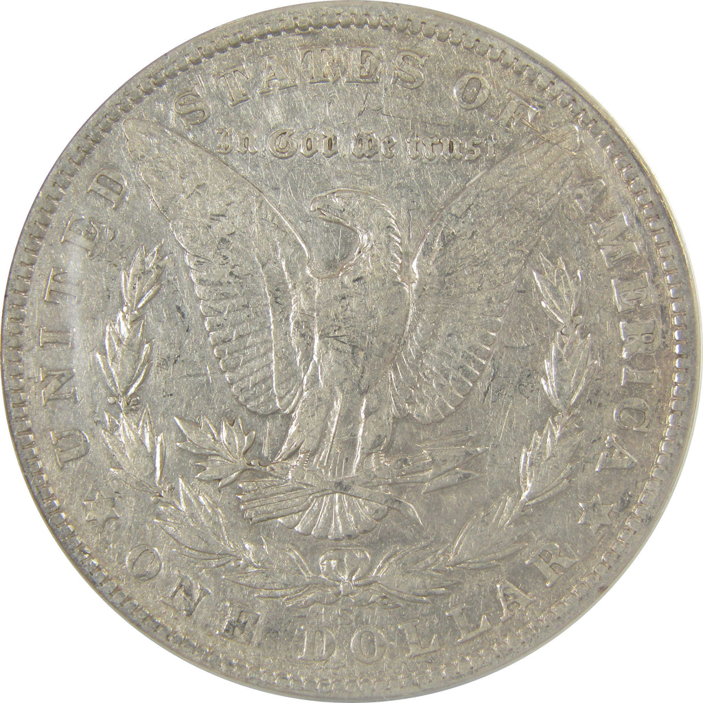 This large 90% silver Morgan dollar bears George T. Morgan's classic depiction of Liberty facing left in a Phrygian cap and a spray of leaves held by a ribbon inscribed LIBERTY. The reverse features an eagle clutching a branch and three arrows.