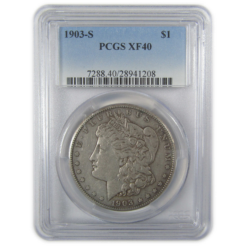 A genuine 1903 S Morgan Silver Dollar Coin, graded and certified XF 40 by PCGS. Contains 90% Silver