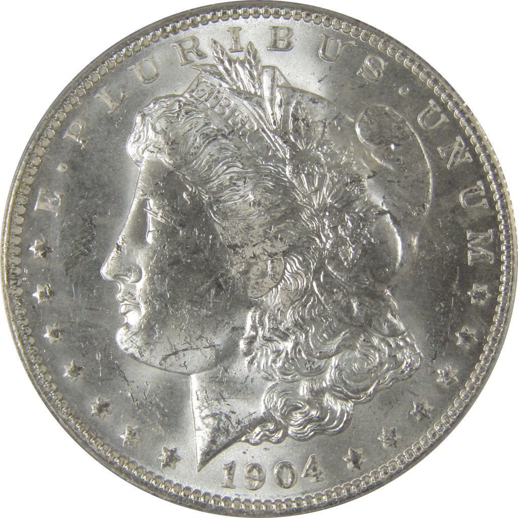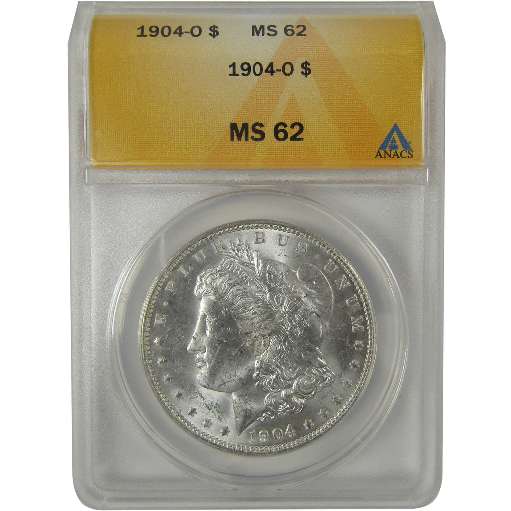 A genuine 1904 O Morgan Silver Dollar Coin, graded and certified MS 62 by ANACS. Contains 90% Silver