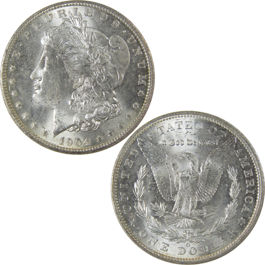 A genuine 1904 O Morgan Silver Dollar Coin, in Uncirculated Mint State Condition. Contains 90% Silver