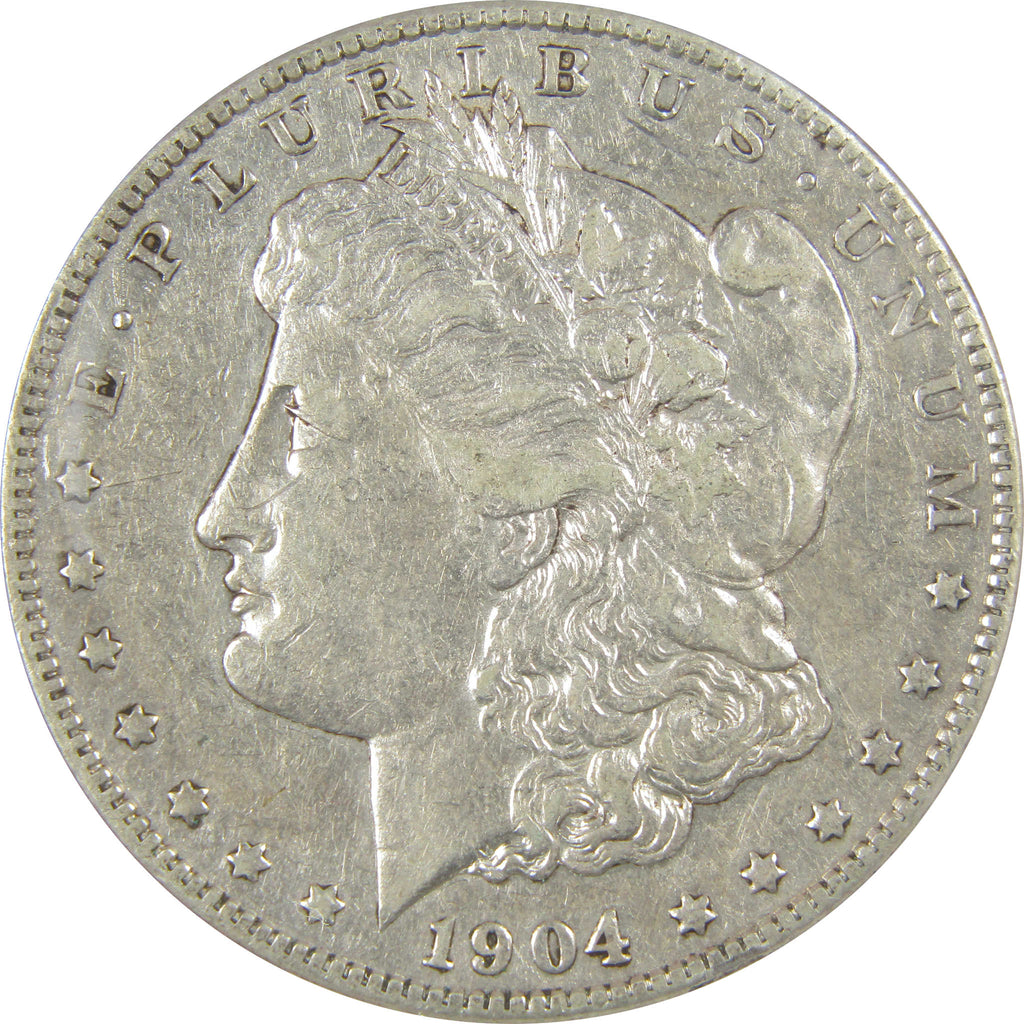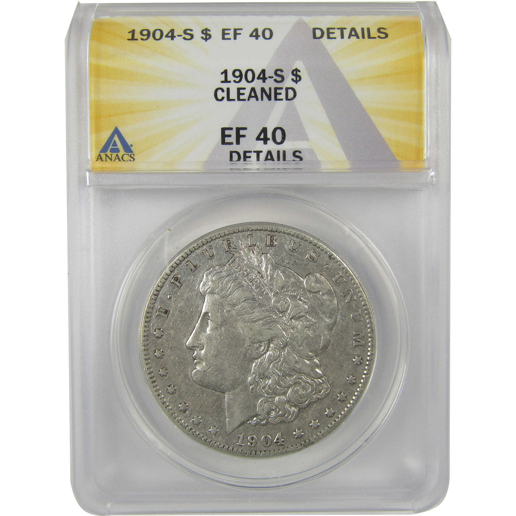 A genuine 1904 S Morgan Silver Dollar Coin, graded and certified EF 40 Details by ANACS. Contains 90% Silver. Cleaned