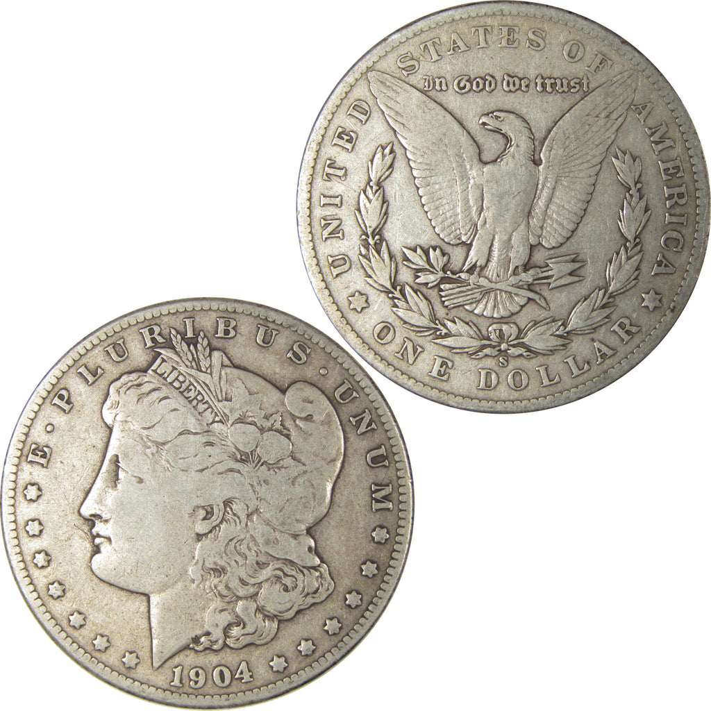 A genuine 1904 S Morgan Silver Dollar Coin, in F Fine Condition. Contains 90% Silver