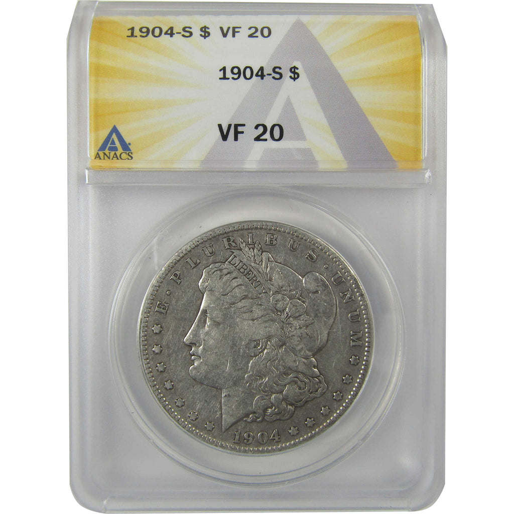 A genuine 1904 S Morgan Silver Dollar Coin, graded and certified VF 20 by ANACS. Contains 90% Silver