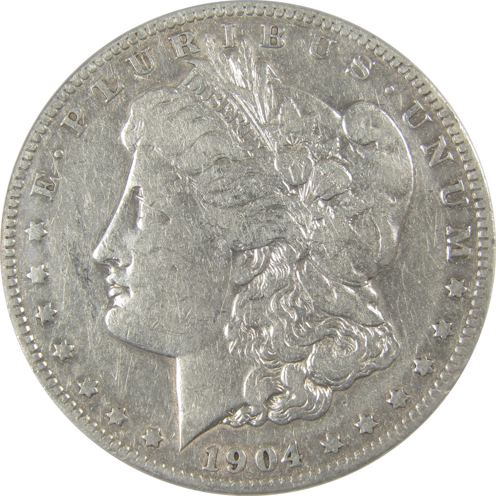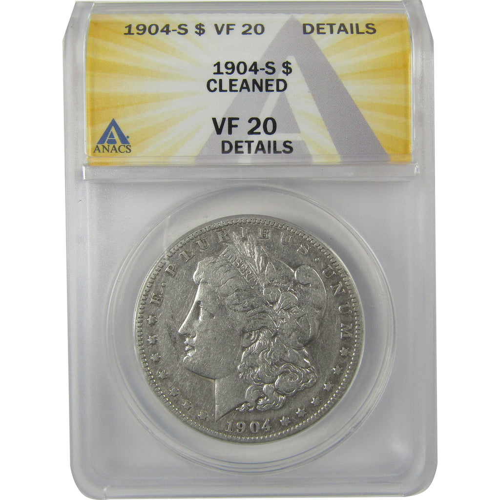 A genuine 1904 S Morgan Silver Dollar Coin, graded and certified VF 20 Details by ANACS. Contains 90% Silver. Cleaned