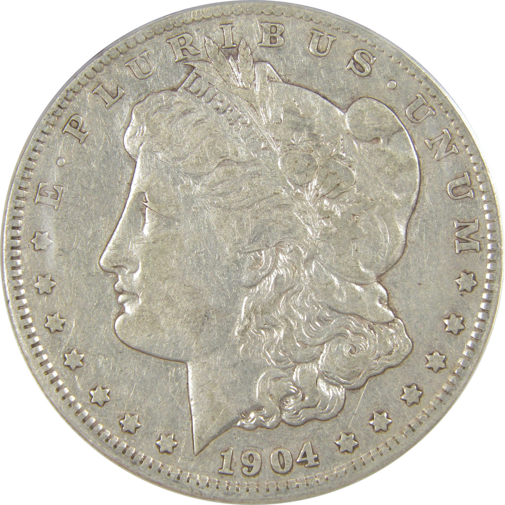 A genuine 1904 S Morgan Silver Dollar Coin, graded and certified VF 25 by ANACS. Contains 90% Silver