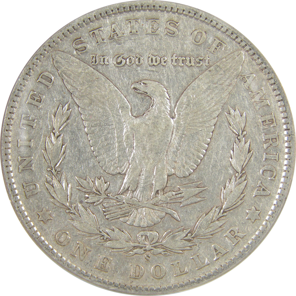 This large 90% silver Morgan dollar bears George T. Morgan's classic depiction of Liberty facing left in a Phrygian cap and a spray of leaves held by a ribbon inscribed LIBERTY. The reverse features an eagle clutching a branch and three arrows.