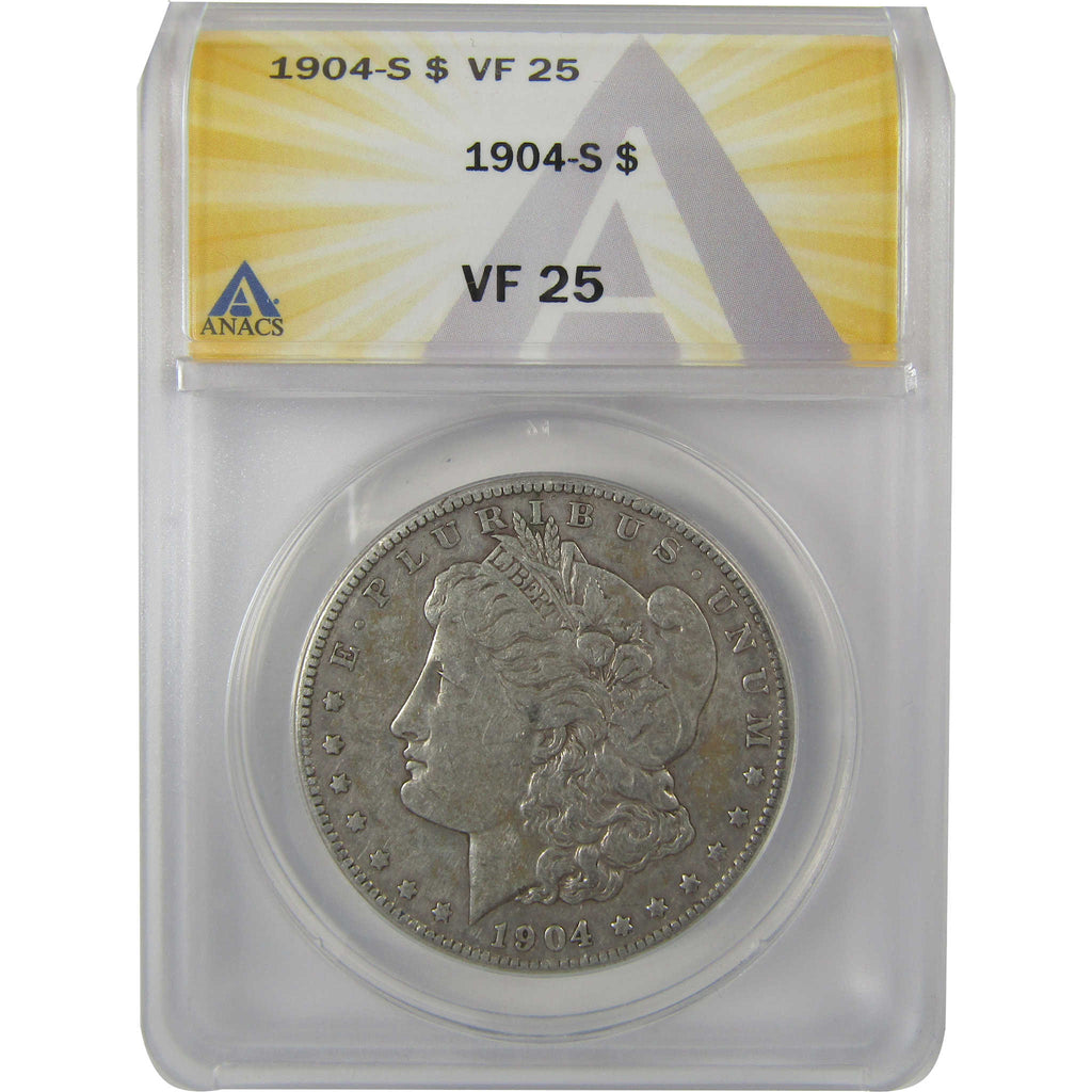 A genuine 1904 S Morgan Silver Dollar Coin, graded and certified VF 25 by ANACS. Contains 90% Silver