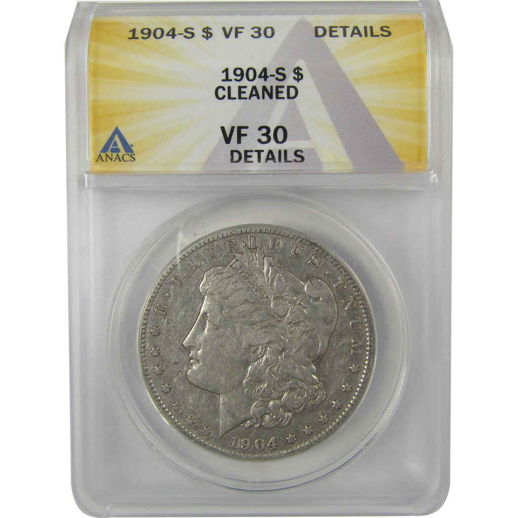A genuine 1904 S Morgan Silver Dollar Coin, graded and certified VF 30 Details by ANACS. Contains 90% Silver. Cleaned