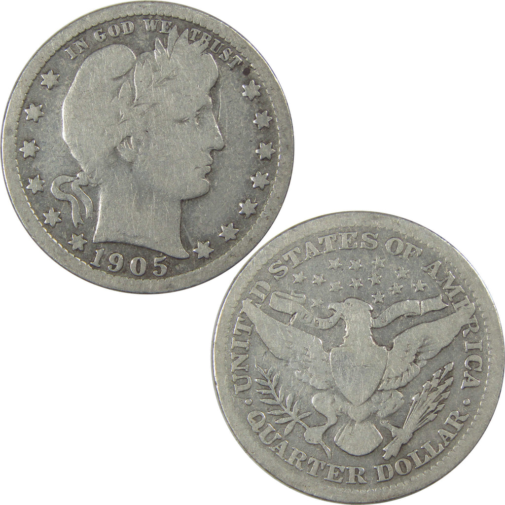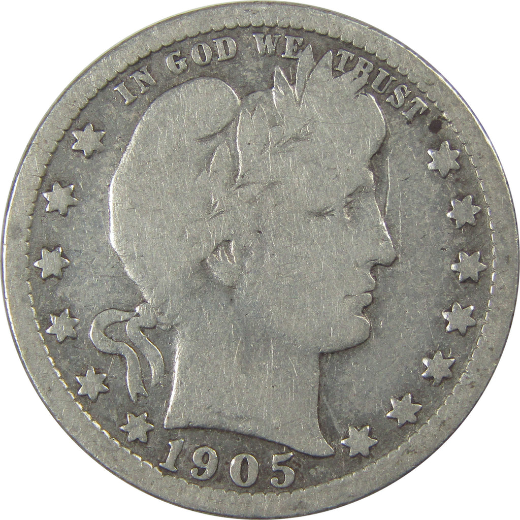 A genuine 1905 Barber Silver Quarter Coin, in G Good Details Condition. Contains 90% Silver. Cleaned