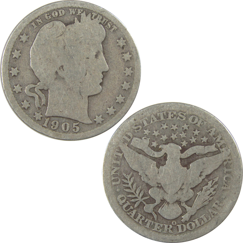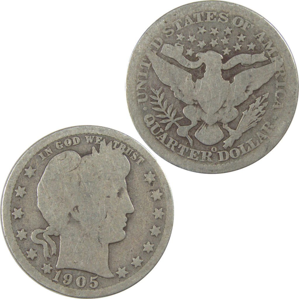 A genuine 1905 O Barber Silver Quarter Coin, in AG About Good Condition. Contains 90% Silver