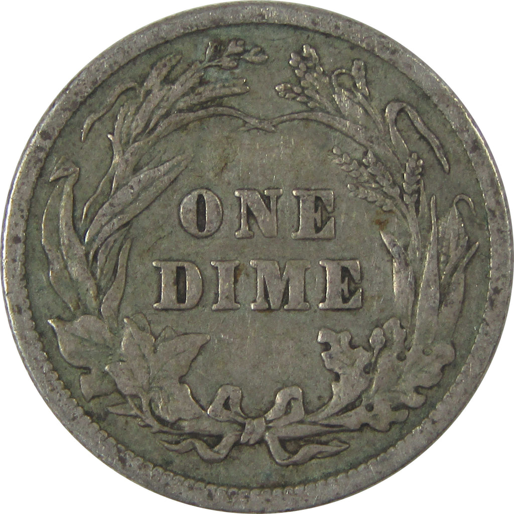 Known as the Barber dime after its designer, this classic Liberty Head dime was struck in 90% silver. Its obverse depicts Liberty facing right wearing a Phrygian cap and laurel wreath, while the reverse shows a wreath and the denomination ONE DIME.