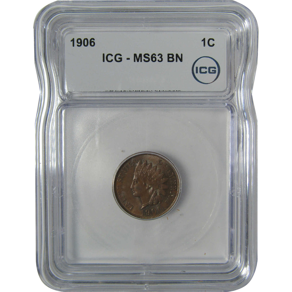 A genuine 1906 Indian Head Cent Penny Coin, graded and certified MS 63 BN by ICG