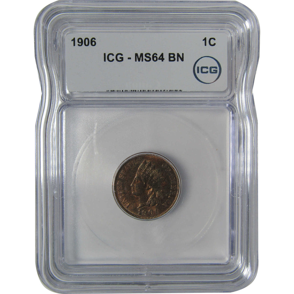 A genuine 1906 Indian Head Cent Penny Coin, graded and certified MS 64 BN by ICG