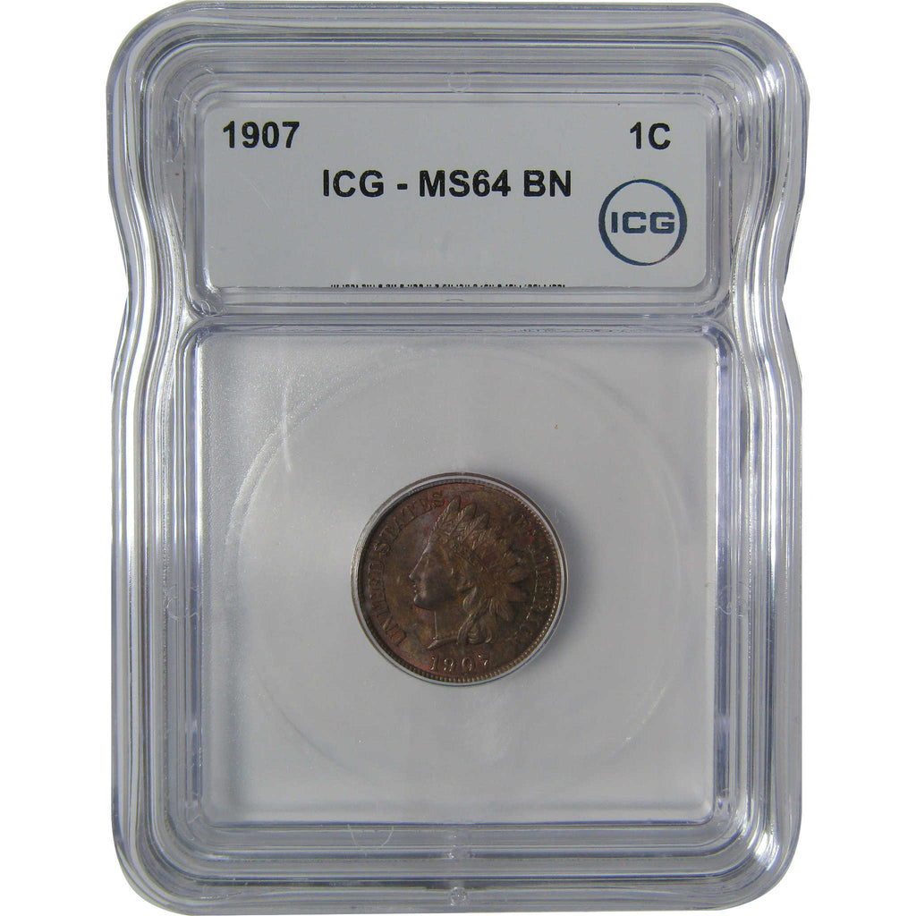 A genuine 1907 Indian Head Cent Penny Coin, graded and certified MS 64 BN by ICG