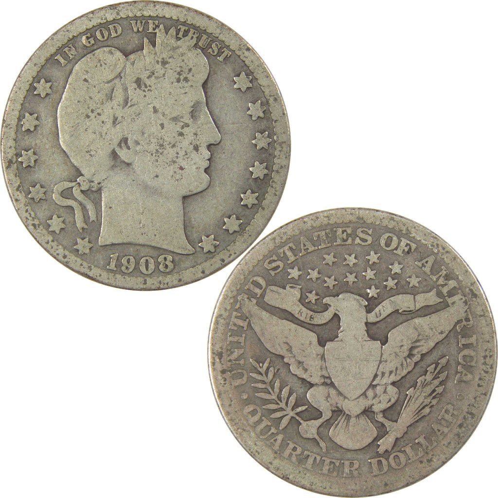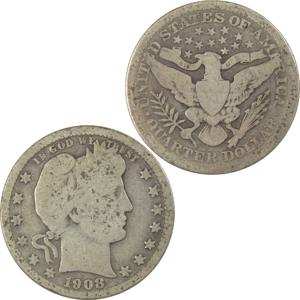 A genuine 1908 Barber Silver Quarter Coin, in G Good Condition. Contains 90% Silver