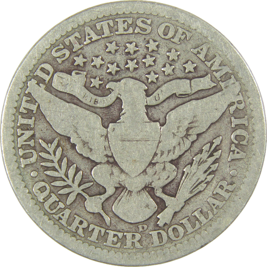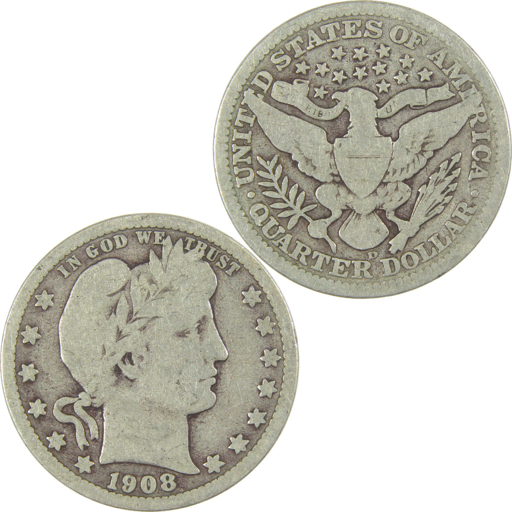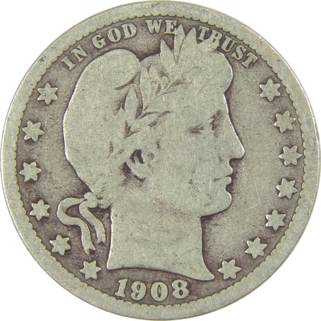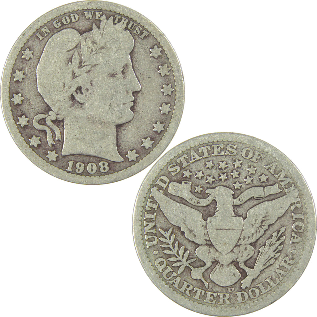 A genuine 1908 D Barber Silver Quarter Coin, in G Good Condition. Contains 90% Silver