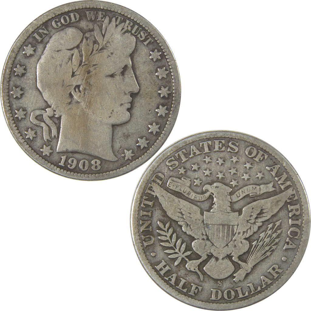 A genuine 1908 S Barber Silver Half Dollar Coin, in VG Very Good Condition. Contains 90% Silver