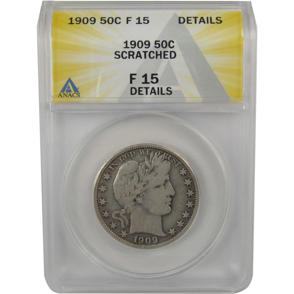 A genuine 1909 Barber Silver Half Dollar Coin, graded and certified F 15 Details by ANACS. Contains 90% Silver. Scratched