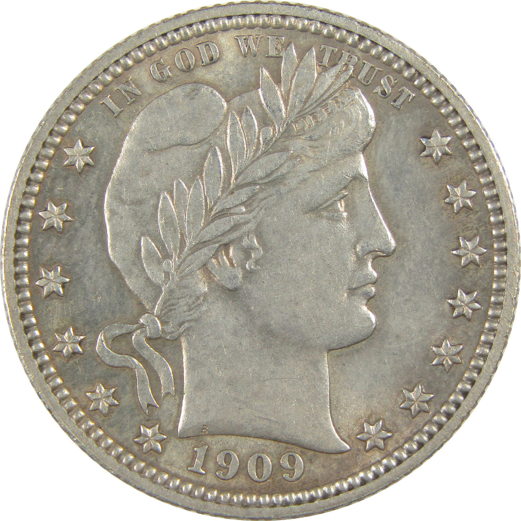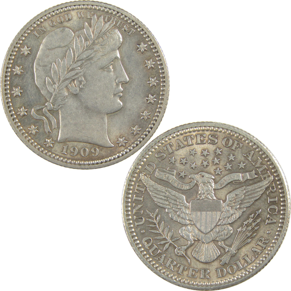 A genuine 1909 Barber Silver Quarter Coin, in Borderline Uncirculated Condition. Contains 90% Silver