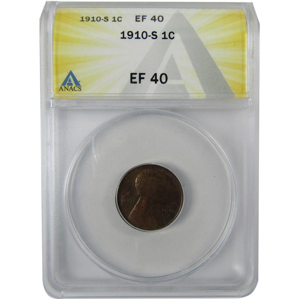 A genuine 1910 S Lincoln Wheat Cent Penny Coin, graded and certified EF 40 by ANACS. Bronze composition