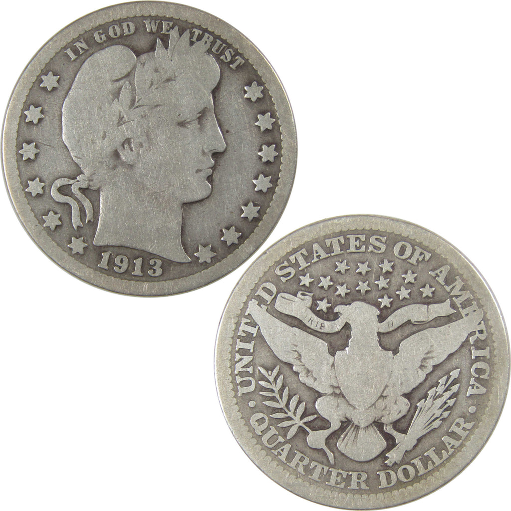 A genuine 1913 Barber Silver Quarter Coin, in G Good Condition. Contains 90% Silver