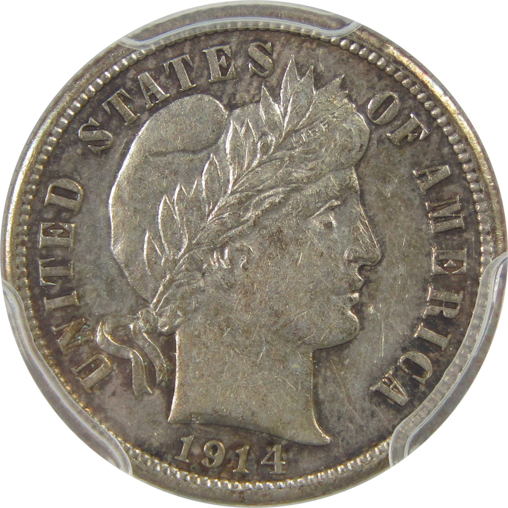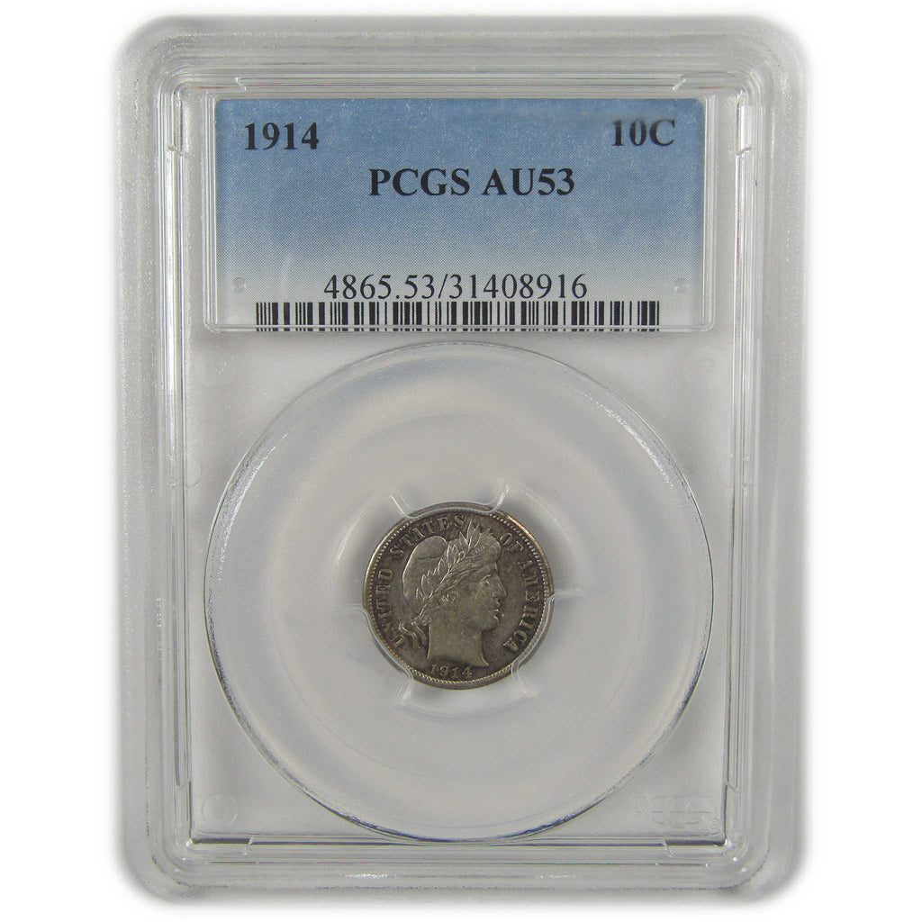 A genuine 1914 Barber Silver Dime Coin, graded and certified AU 53 by PCGS. Contains 90% Silver