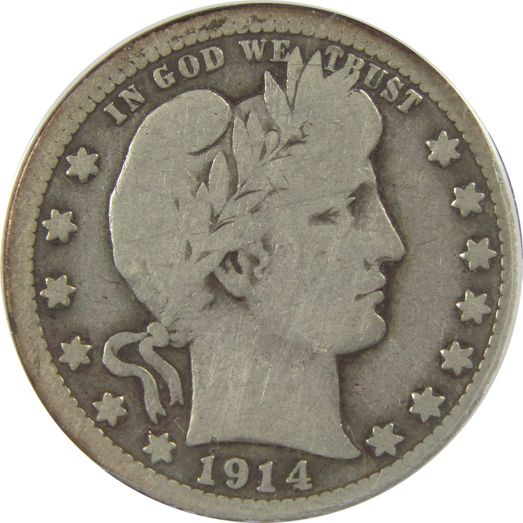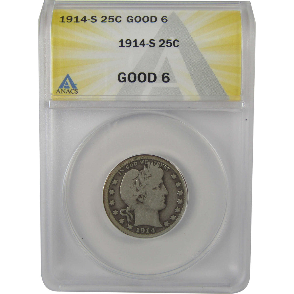 A genuine 1914 S Barber Silver Quarter Coin, graded and certified G 6 by ANACS. Contains 90% Silver
