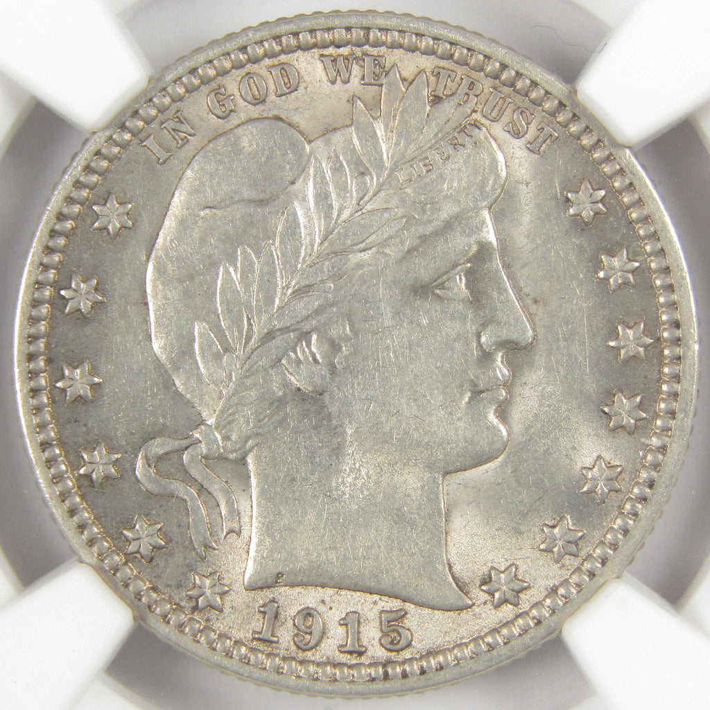 A genuine 1915 Barber Silver Quarter Coin, graded and certified AU 53 by NGC. Contains 90% Silver