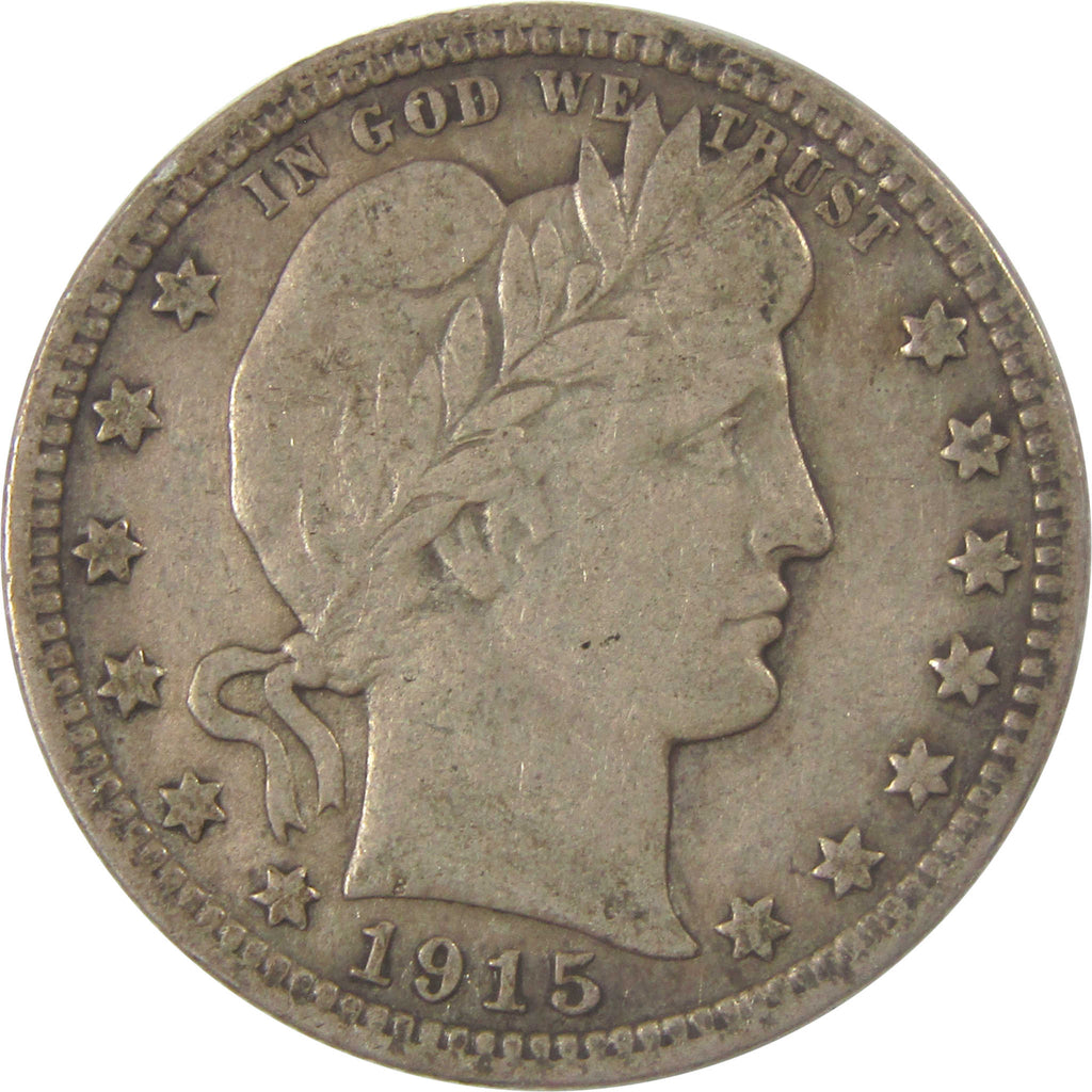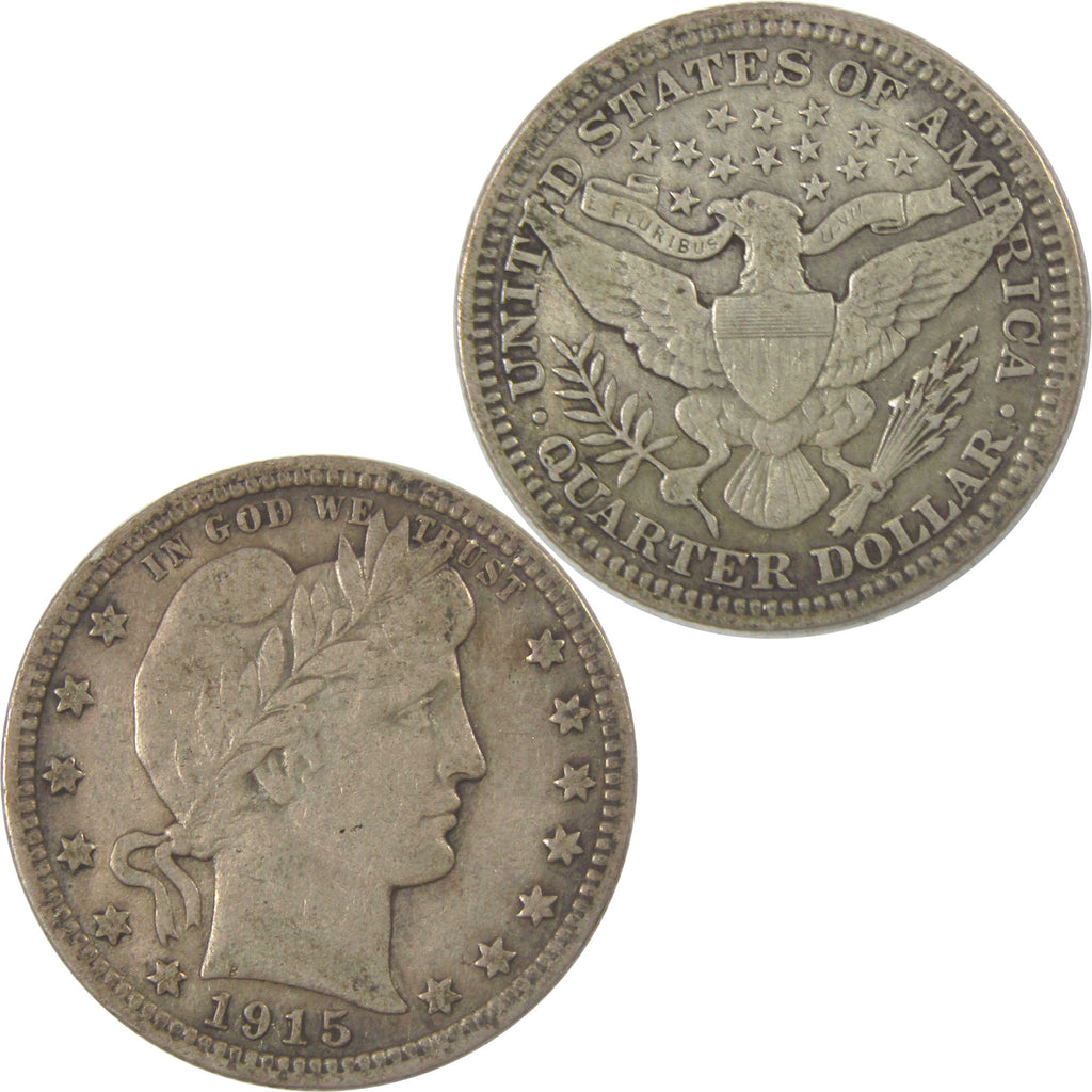 A genuine 1915 Barber Silver Quarter Coin, in VF Very Fine Condition. Contains 90% Silver