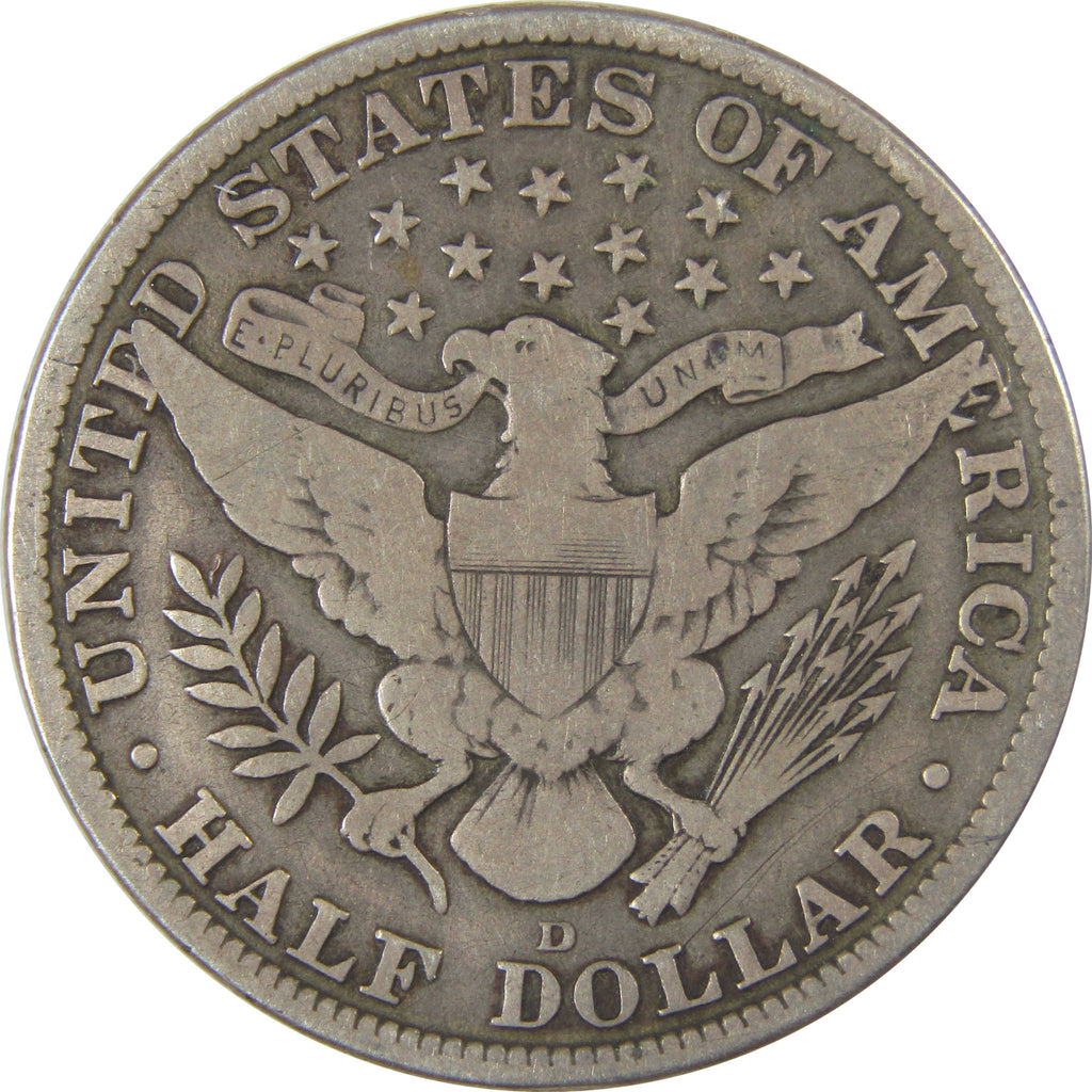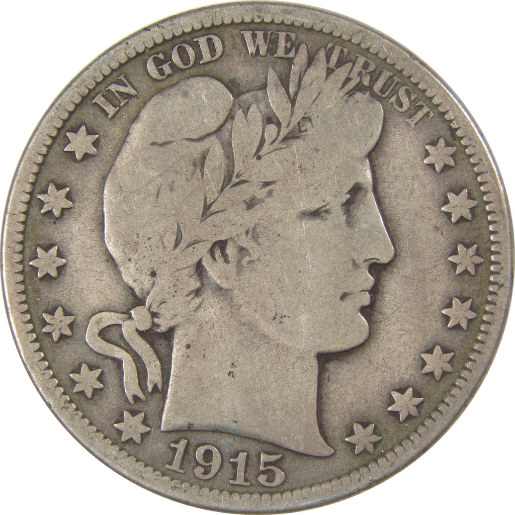 A genuine 1915 D Barber Silver Half Dollar Coin, in VG Very Good Details Condition. Contains 90% Silver. Cleaned