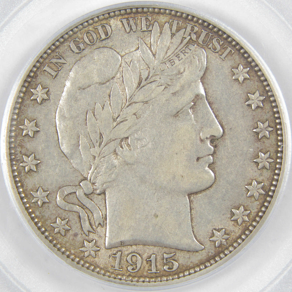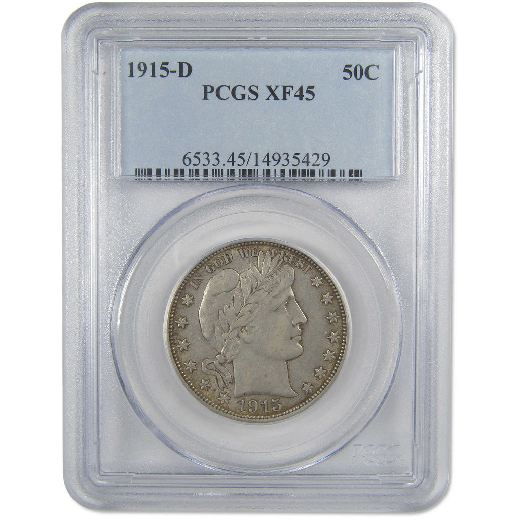 A genuine 1915 D Barber Silver Half Dollar Coin, graded and certified XF 45 by PCGS. Contains 90% Silver