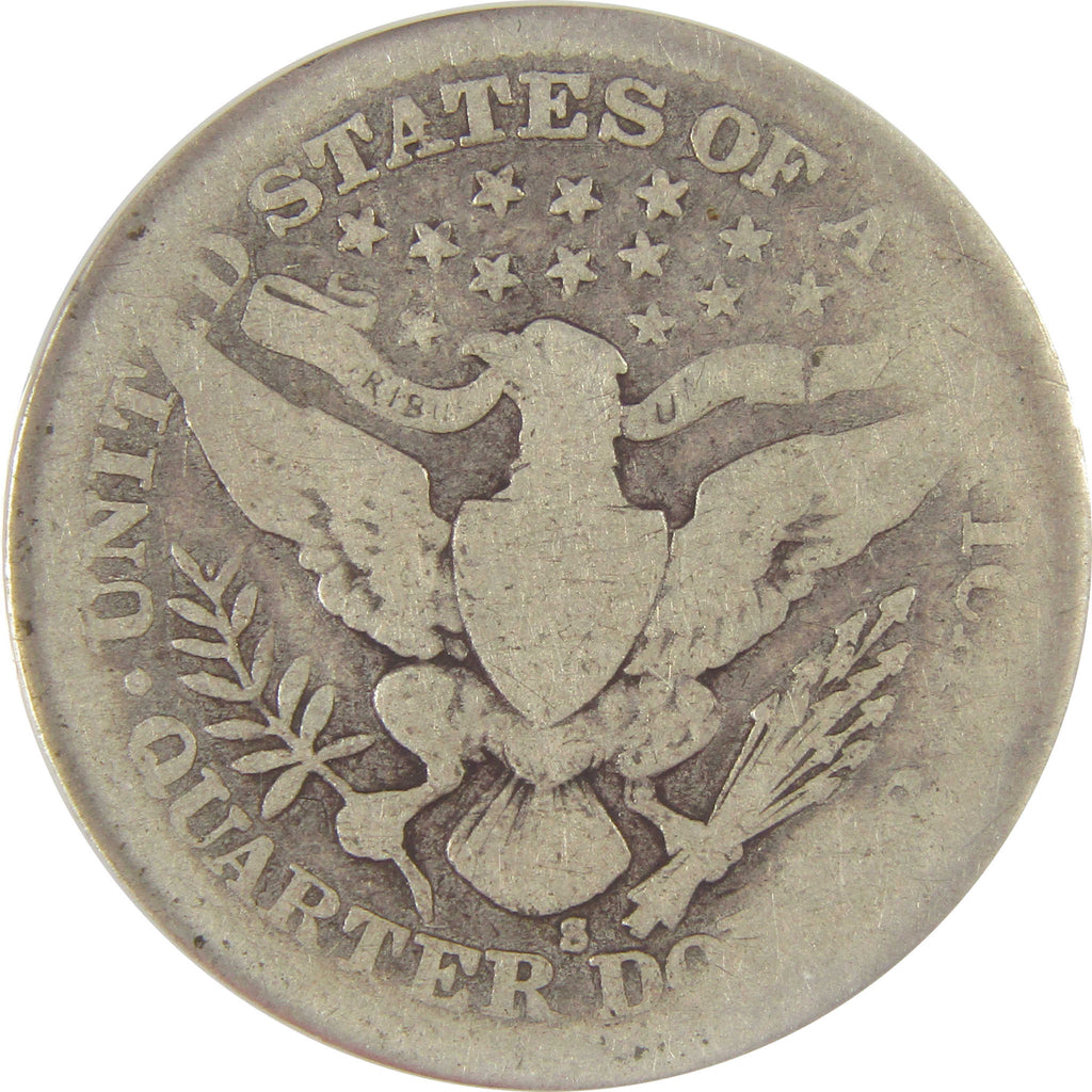 Designed by Charles E. Barber, this 90% silver Liberty Head quarter (or Barber quarter) depicts Liberty wearing a laurel wreath and Phrygian cap with a band inscribed LIBERTY. The reverse bears an adaptation of the Great Seal of the United States.