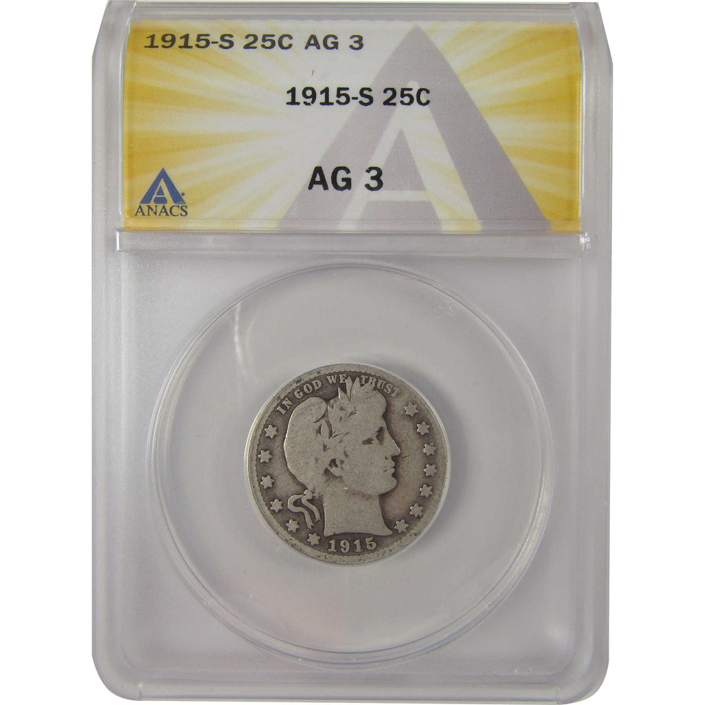 A genuine 1915 S Barber Silver Quarter Coin, graded and certified AG 3 by ANACS. Contains 90% Silver