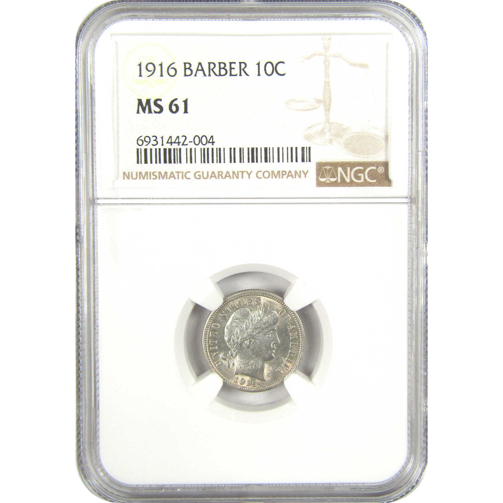 A genuine 1916 Barber Silver Dime Coin, graded and certified MS 61 by NGC. Contains 90% Silver