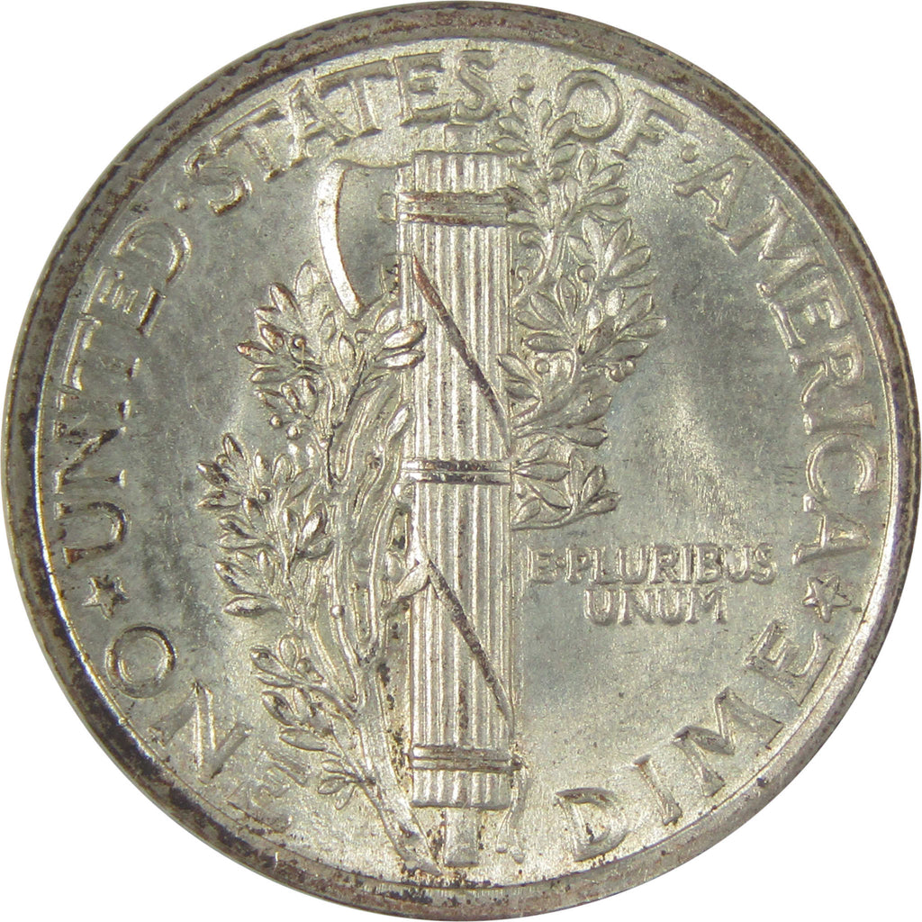 This 90% silver Mercury dime was designed by A.A. Weinman, who also created the Liberty Walking half dollars of 1916-1947. Its obverse features Liberty in a winged cap to symbolize freedom of thought. The reverse depicts a fasces against a branch in the background.
