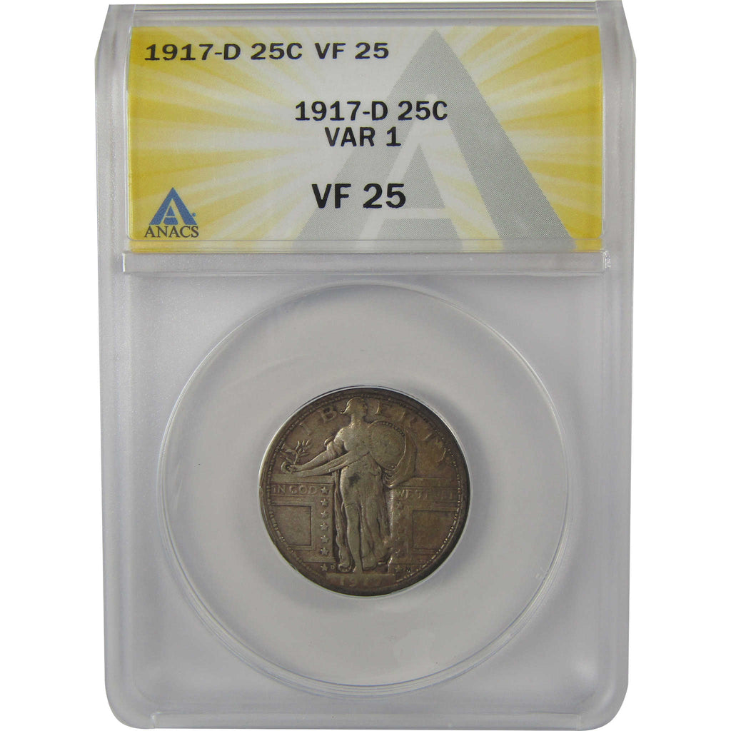 A genuine 1917 D Type 1 Standing Liberty Silver Quarter Coin, graded and certified VF 25 by ANACS. Contains 90% Silver