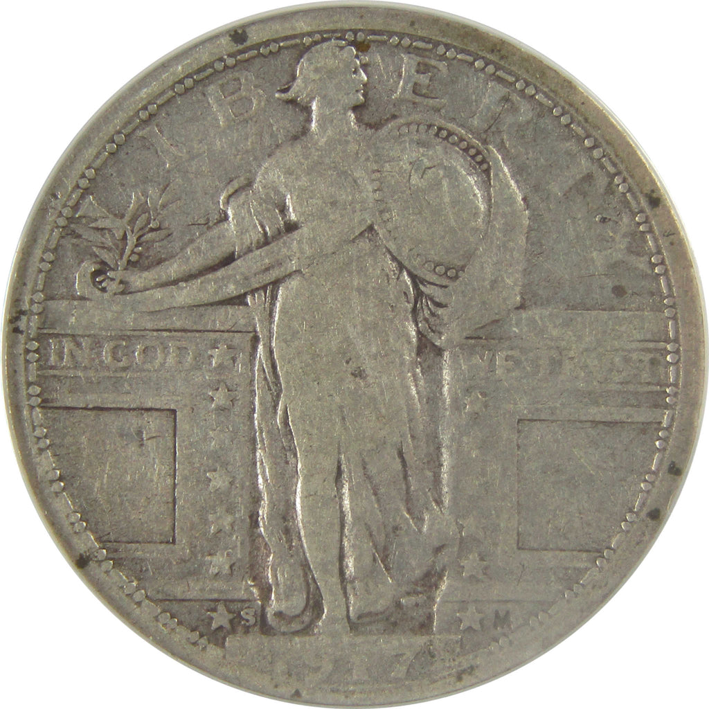 A genuine 1917 S Type 1 Standing Liberty Silver Quarter Coin, graded and certified F 12 by ANACS. Contains 90% Silver
