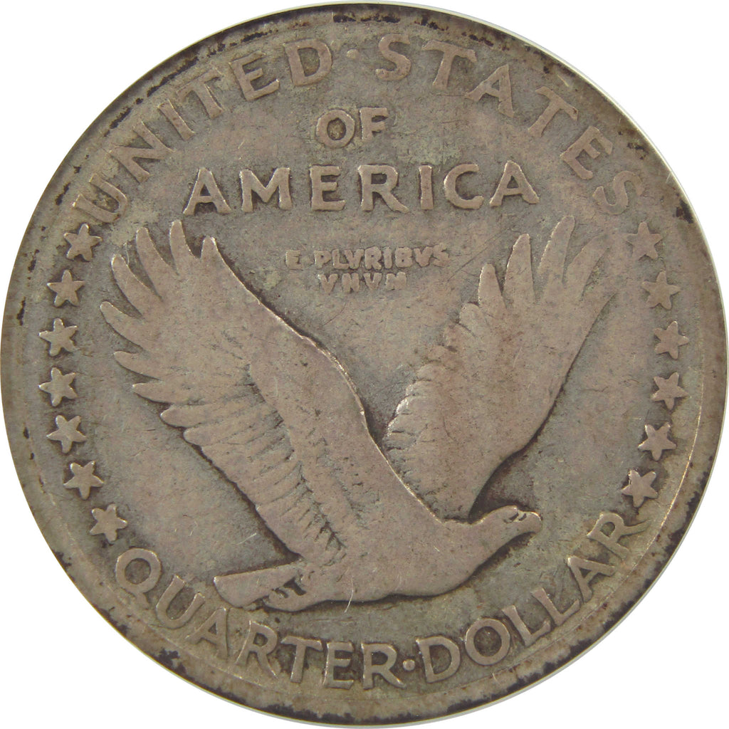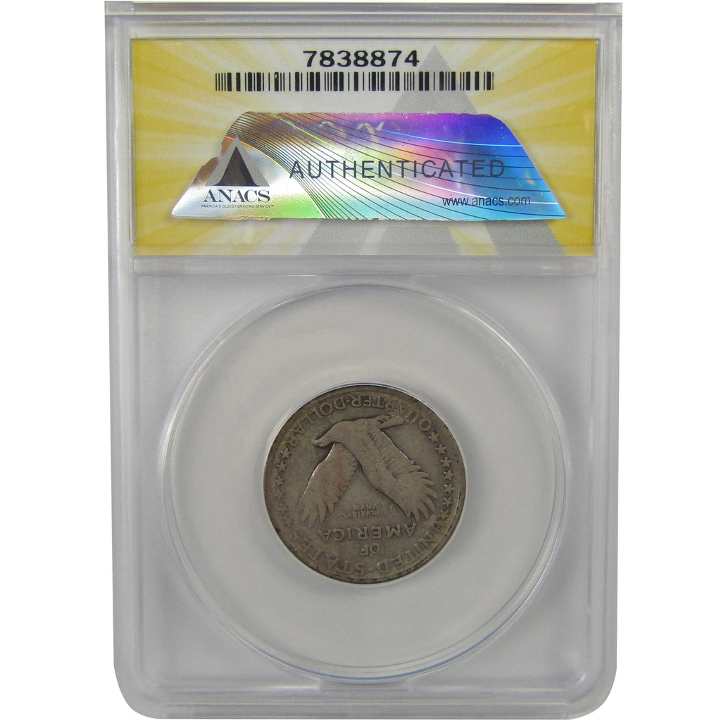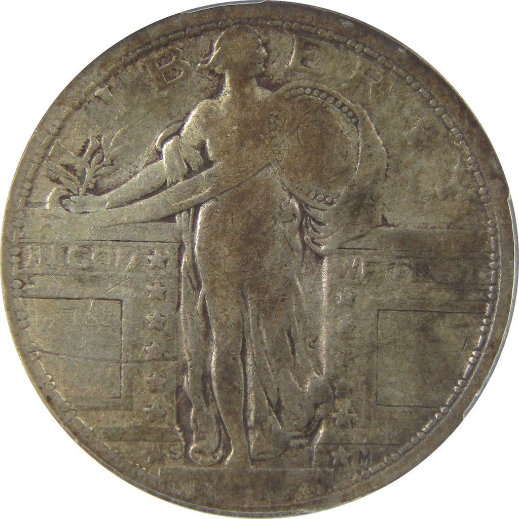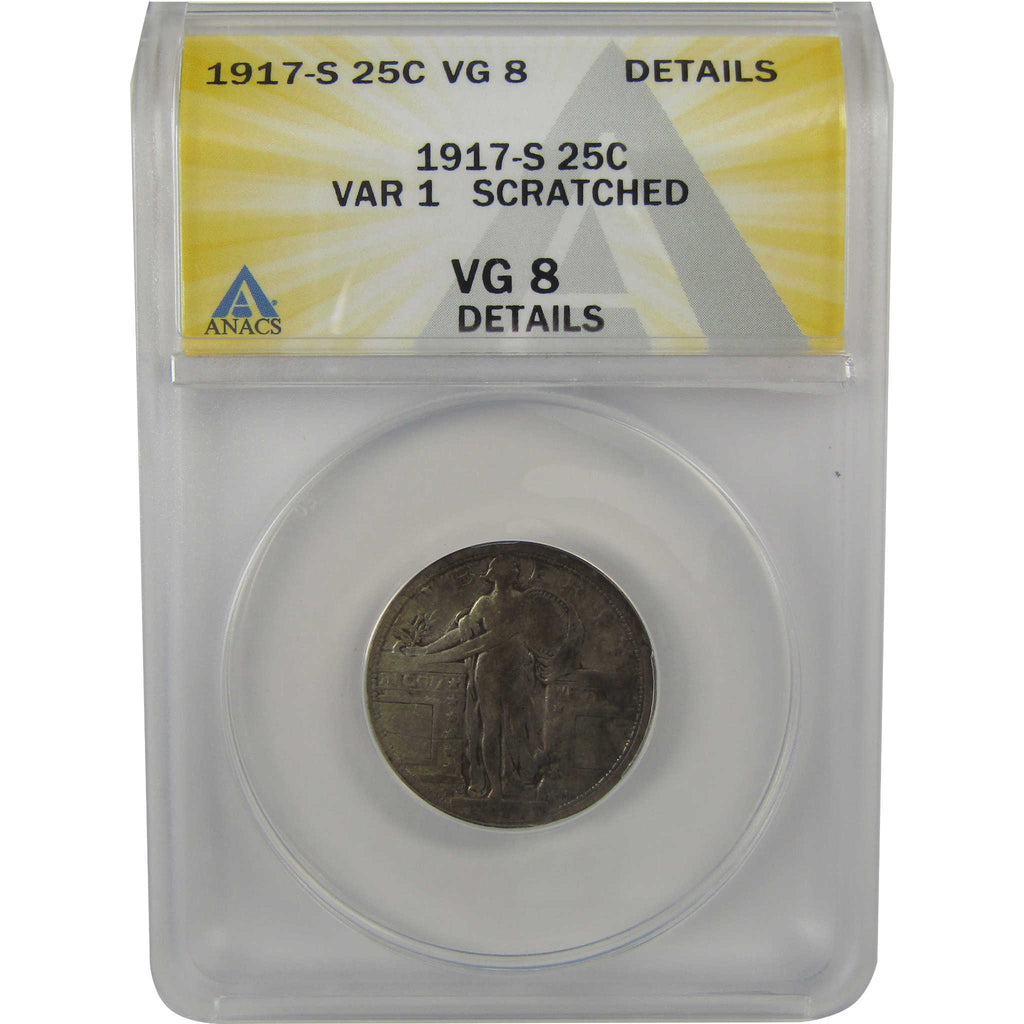 A genuine 1917 S Type 1 Standing Liberty Silver Quarter Coin, graded and certified VG 8 Details by ANACS. Contains 90% Silver. Scratched
