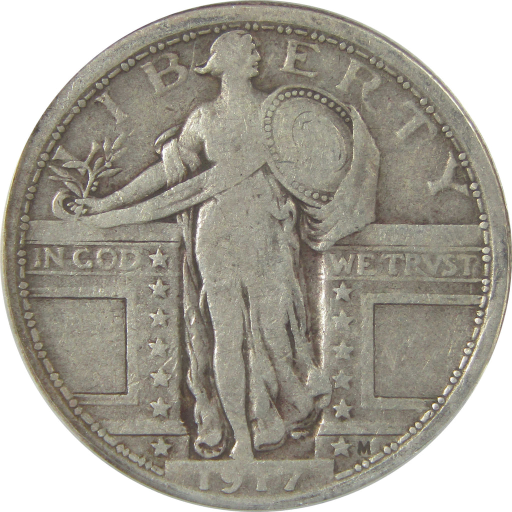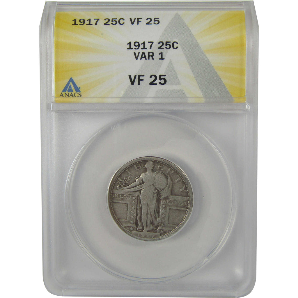 A genuine 1917 Type 1 Standing Liberty Silver Quarter Coin, graded and certified VF 25 by ANACS. Contains 90% Silver