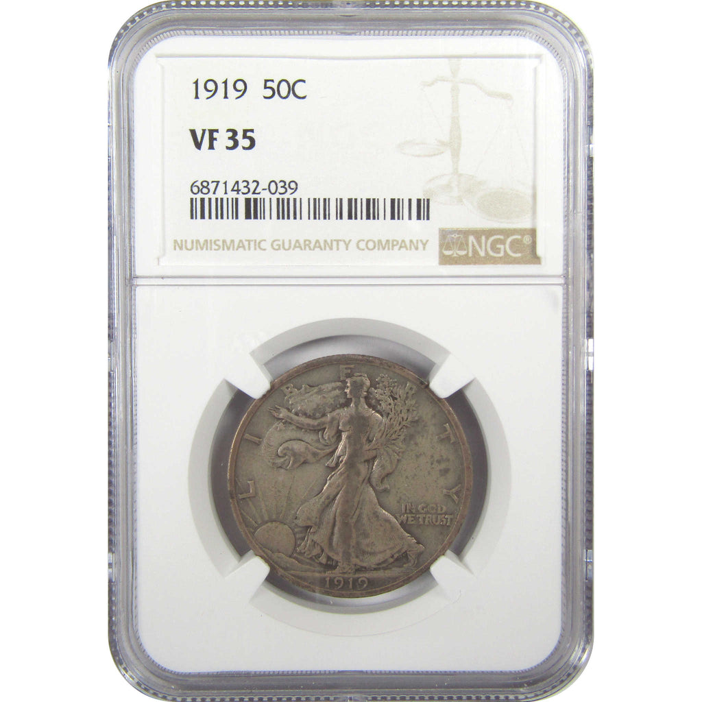 A genuine 1919 Liberty Walking Silver Half Dollar Coin, graded and certified VF 35 by NGC. Contains 90% Silver